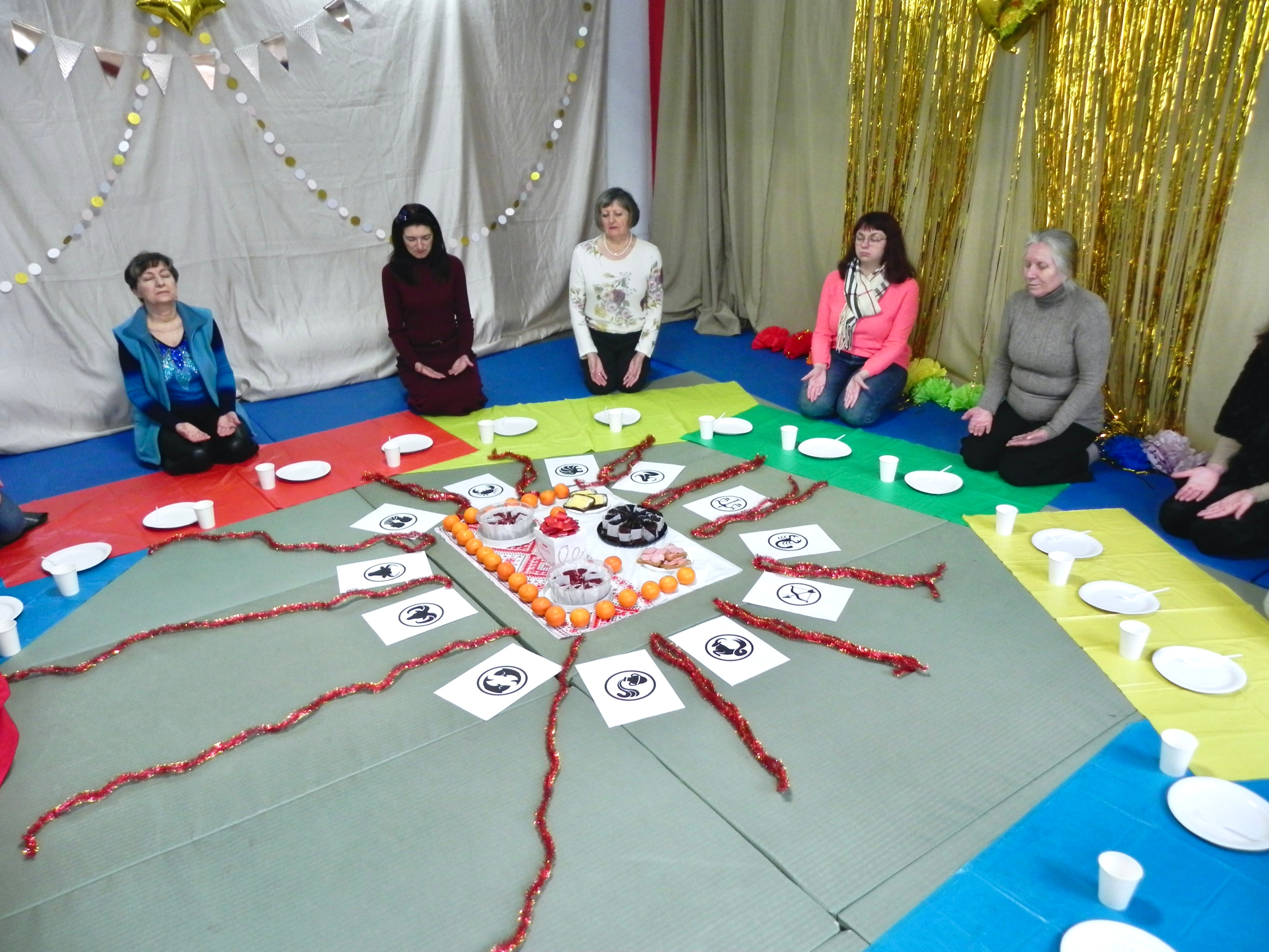 Традиционное чаепитие мы начали с практики «Рождественское угощение». Праздничный стол разделили на 12 секторов, где каждый сектор символизировал свой энергопоток знака Зодиака. В центре стола стояли рождественские угощения.